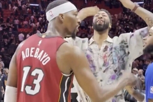 GIF-浓眉和阿德巴约拥抱 向观众台献飞吻 还尖笑